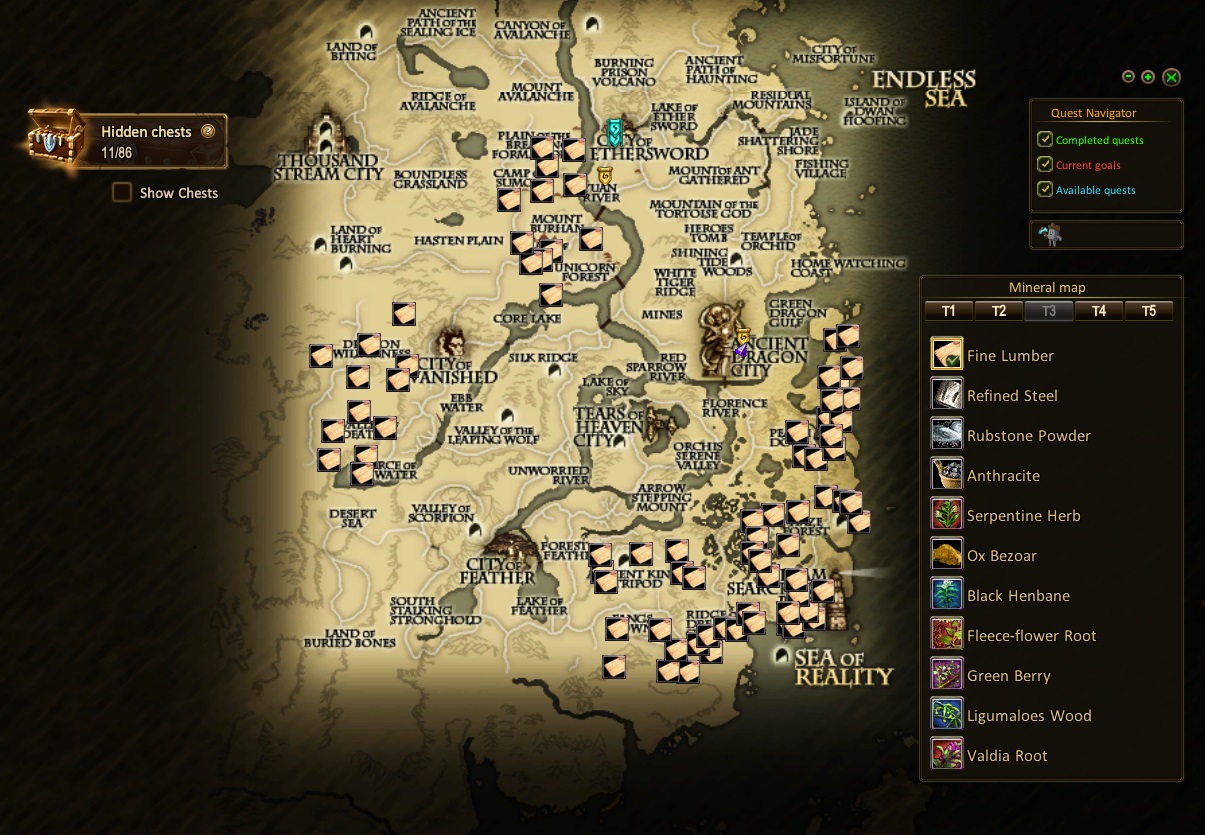 - The game map (M) now displays a chest icon, clicking on which you can view the contents of a hidden chest. It also displays information about available chests and the total number of hidden chests, for example, 52/100